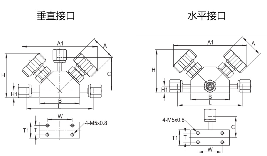 | 编码 | 两端接头 | L(mm) | A(mm) | A1(mm) | B(mm) | C(mm) | H(mm) | H1(mm) | W(mm) | T(mm) | T1(mm) |