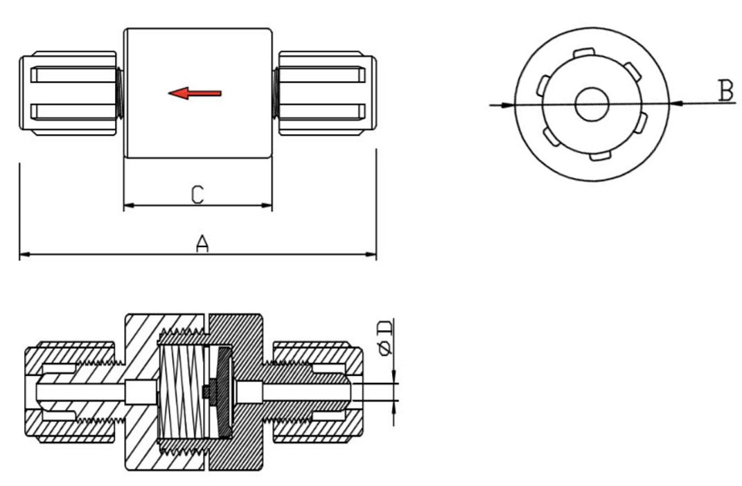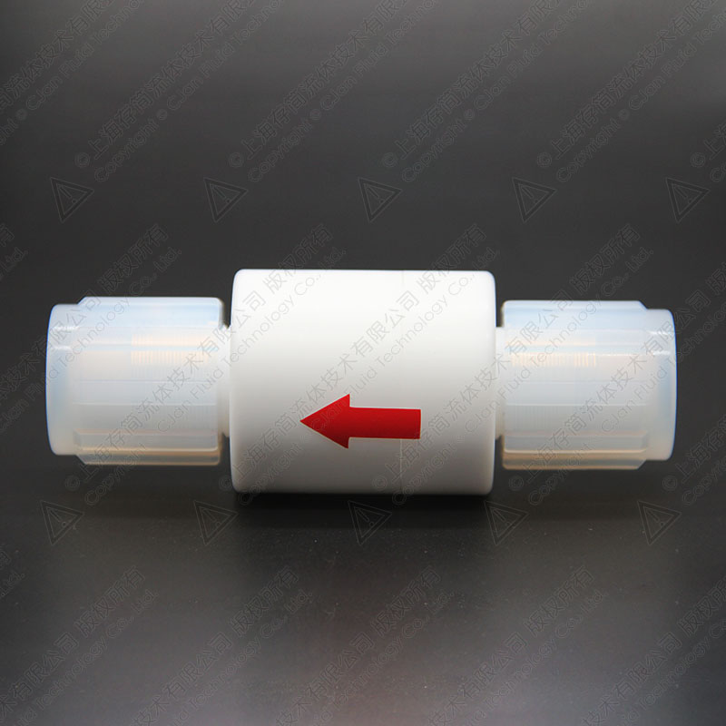 特性:1.高纯、耐腐蚀。四氟单向阀(止回阀)TCV采用机加工PTFE组件,无任何金属材质,提供卓越的耐化学性和纯度。2.特殊密封设计,无需O形圈进行密封。3.机加工的PTFE弹簧开启压力低,同时能以最小的背压重新密封。4.明确的流动方向:产品上贴有的明确的箭头指示
