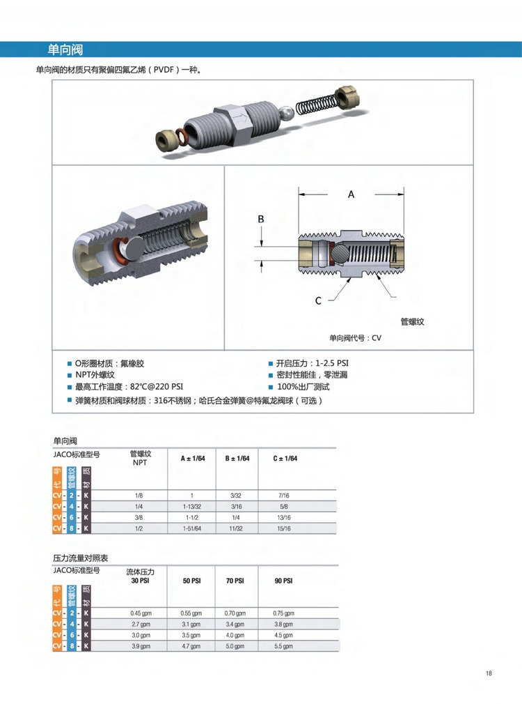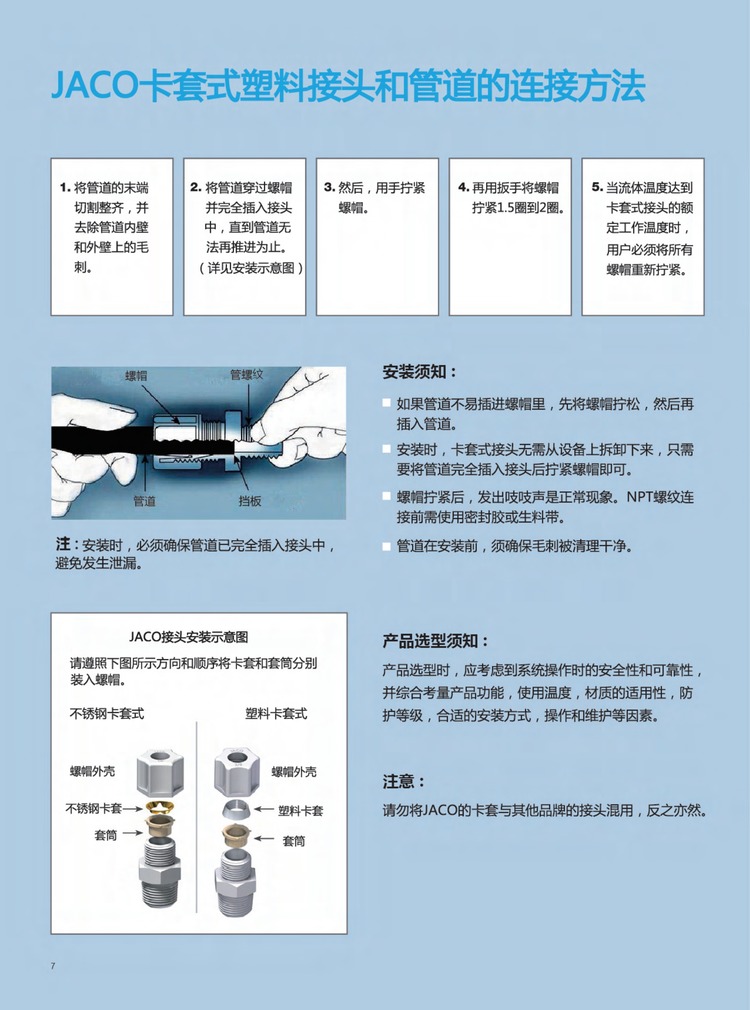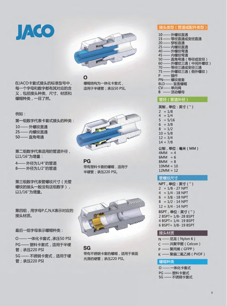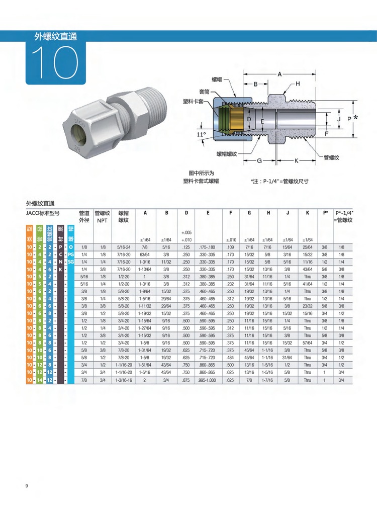 注:JACO可为客户定制公制尺寸、BSPT螺纹和黑色卡套式接头。如有需求,请联系公司销售人员。