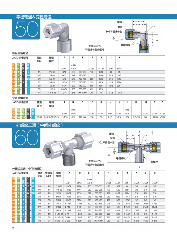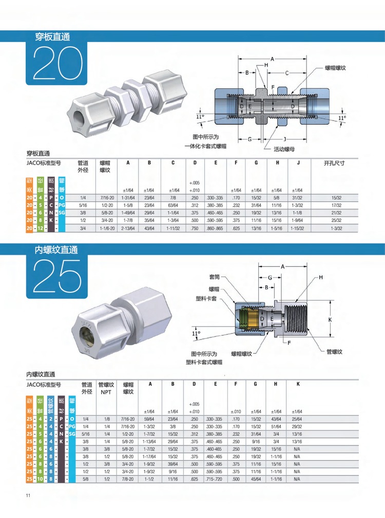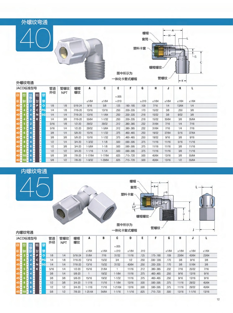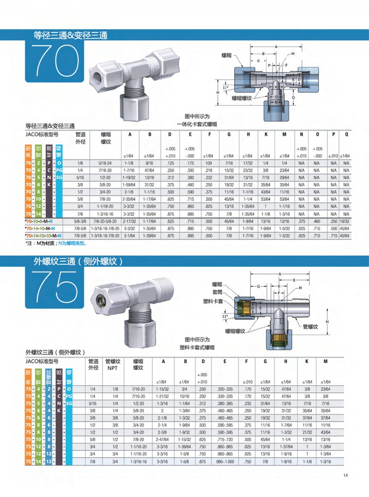 JACO卡套式接头适用于外径为1/8"-7/8"的英制尺寸管道,按种类可分为直通、三通、弯通、外螺纹直通等。