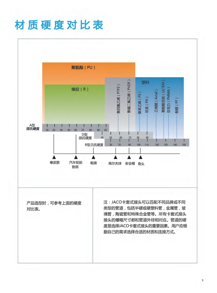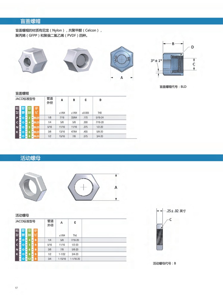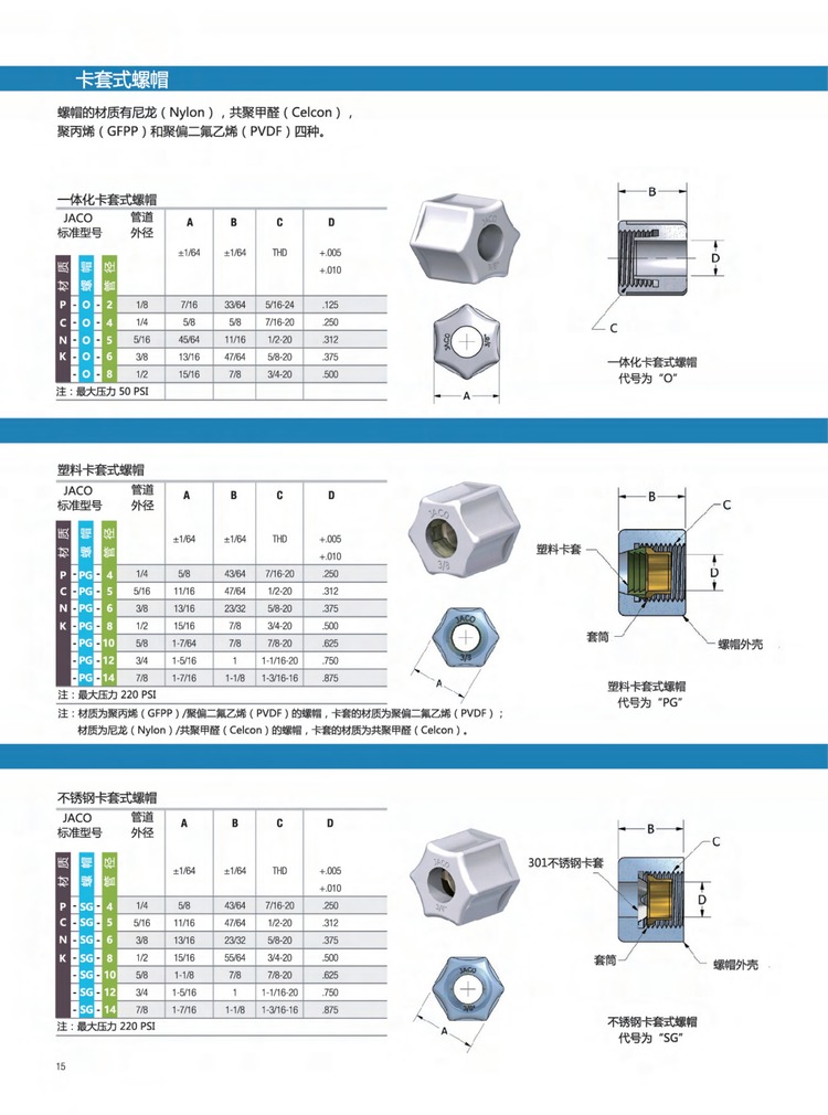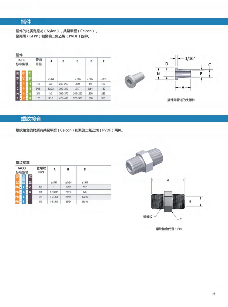 根据不同的使用环境,可选用不同材质的接头。JACO卡套式接头的材质可分为尼龙(Nylon)、共聚甲醛(Celcon)、聚丙烯(GFPP)和聚偏二氟乙烯( Kynar/PVDF )四种。