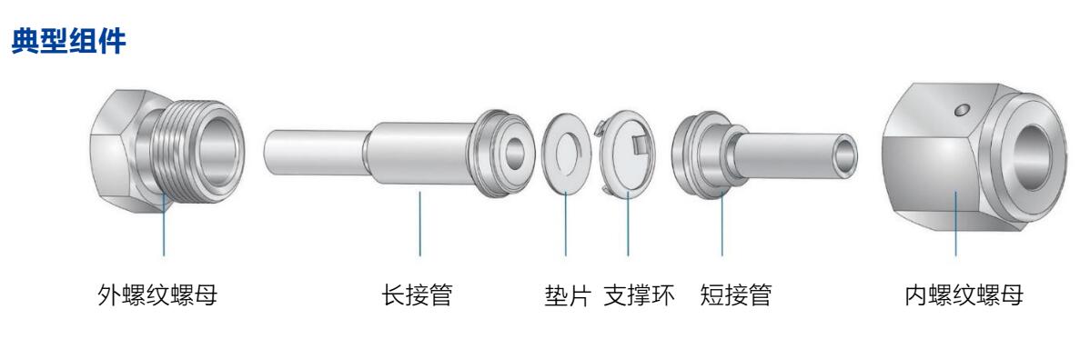 VCR接头通常由5个部分组成:2个接管、1个外螺纹(公头)螺母、1个内螺纹(母头)螺母和一个垫片。